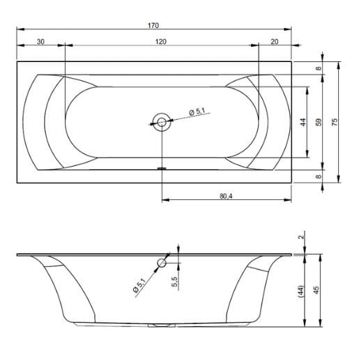 Dostępna w 6 rozmiarach – 150 cm, 160 cm, 170 cm, 180 cm, 190 cm, 200 cm. Przelew i odpływ umiejscowione centralnie. Do wanny można dopasować parawan nawannowy. Wysokość rantu - 2 cm.